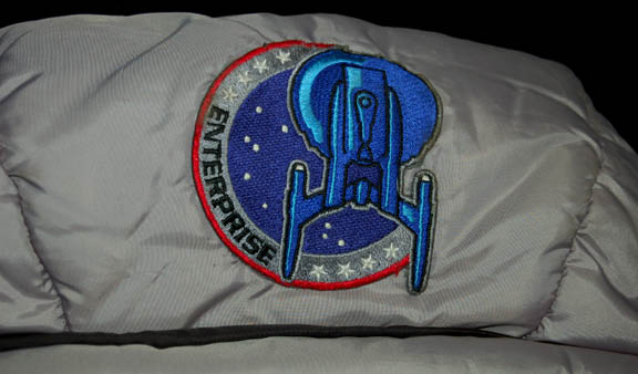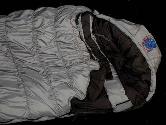 Description: A full length adult sized gray sleeping bag featured in the Star Trek: Enterprise episode “Strange New World” in which an away team from “Enterprise” camps out on a world they are scouting. The sleeping bag is a ‘Sierra Designs, Polar Guard 3D' brand bag with a zip up the left side, Velcro seals for the ‘hood’ and tightening drawstrings. The hood of the bag features a sewn on “Enterprise NX-01” assignment patch. Characters who interacted with bags like this in the episode were “T’Pol” (Jolene Blalock), “Commander Tucker” (Connor Trinneer), “Travis Mayweather” (Anthony Montgomery), and “Crewman Cutler (Katie Waymire), and “Crewman Novakovich” (Henri Lubatti).