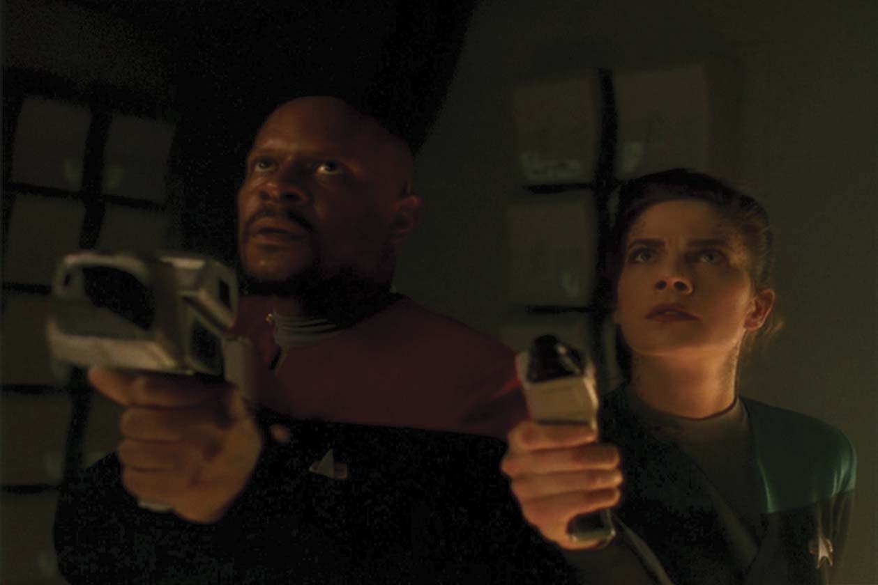Description: (Paramount-TV, 1993-99) This standard DS9 Starfleet-issue phaser rifle is constructed of molded resin painted black and silver, with a pop-up sight and attached illuminating scope. This rifle is specifically from the sixth season episode, "Change of Heart." Measures 25 in. in length.