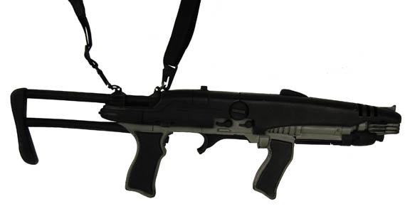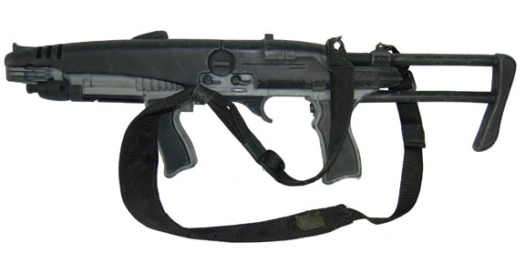 Description: When the “Xindi” attacked Earth without provocation in the Star Trek: Enterprise episode “The Expanse” the crew of “Enterprise NX-01” took on additional support in the form of the “MACOs” (Military Assaule Command Ops), a rough and tumble team of military marines with formidable weapons. This prop assault rifle is one of them. Featured proximately in episodes like “Anomaly”, “Hatchery”, Countdown”, and “Zero Hour” this popular contingent continued to serve aboard Starfleet's first warp-5 starship through the fourth season. Made from sturdy foam rubber featuring black and flat gray painted details, and metal loops and clips for a black nylon shoulder strap. Measures approx. 25 X 7 X 2.5 inches.