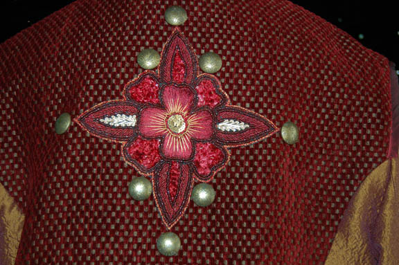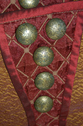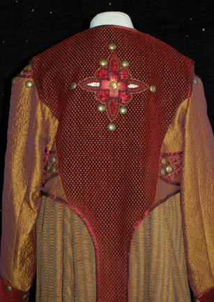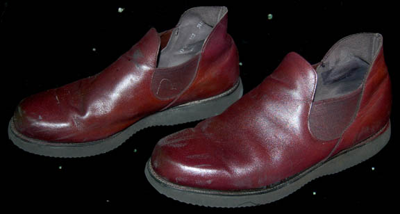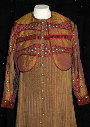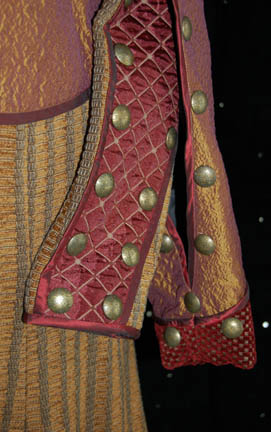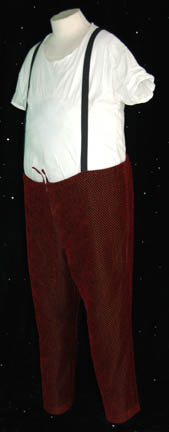 Description: From the episode “Babel One” of Star Trek: Enterprise this elaborate costume was worn by an actor portraying a ‘Tellarite'. It is composed of highly textured burgundy pants with gold squares inset in a pattern, and an overcoat featuring some of the same material up the back but with added pleated gold textured fabric. The overcoat has a cape that is sewn on, featuring crumple texture color changing fabric and multiple brass colored buttons. The overcoat zips up the center. The entire costume is worn over a white ‘fat suit’ and comes complete with matching shoes.