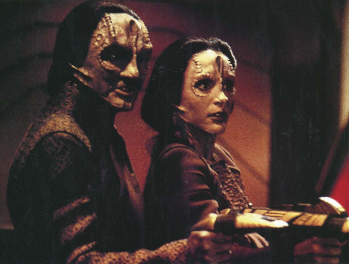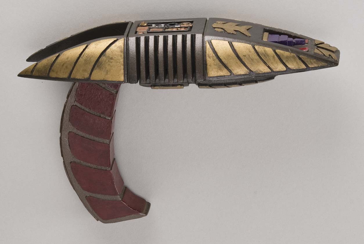 Description: (Paramount-TV, 1993-99) Rare ornate gold and maroon-painted molded resin, with purple tip on the top from where the phaser beam would be emitted. Used throughout the series by the main occupants and builders of the Deep Space Nine space station. There were no working versions of this model made. Measures 9 ½ in. in length.