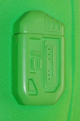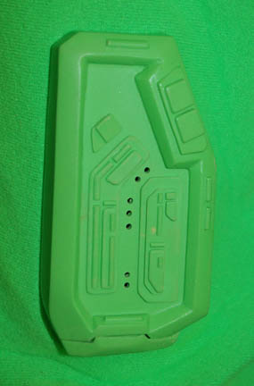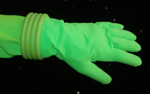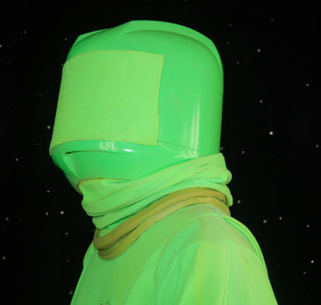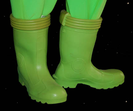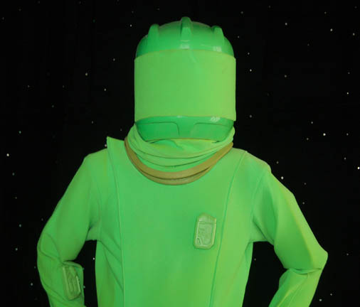 Description: This costume was made to create special effects during the opening scenes of the Star Trek feature film “Insurrection” for the Starfleet Federation “Isolation suit”. The green jumpsuit has a rubber neckline, a Velcro waist for the rubber belt to attach and stirrups for the feet and thumbs to hold the fabric taut. Attached to the jumpsuit on the chest and right sleeve are two green rubber “cloaking devices” that do not light up. The suit comes with a green plastic helmet that has green fabric across the front allowing for the suit to become completely invisible using green screen special effects. Also included are green rubber boots and green gloves. The accompanying tag indicates this item was made for “Data” but was “Never camera-shot visual-effect”.