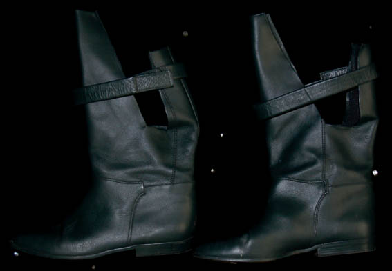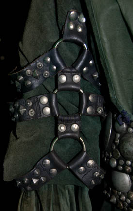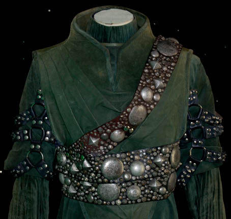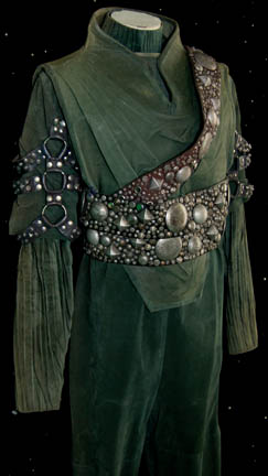 Description: A costume lot featured in the Star Trek: The Next Generation episode “The Outcast” worn by an androgynous alien ‘J'Naii Guard’. The costume consists of a jumpsuit, dickie, 2 vests, 4 hoods, 2 sleeve pieces, 2 pairs of boots all green hued and suede. The costumer’s tags indicate wear in the episode “The Outcast” and finding further use in Star Trek: Deep Space Nine.