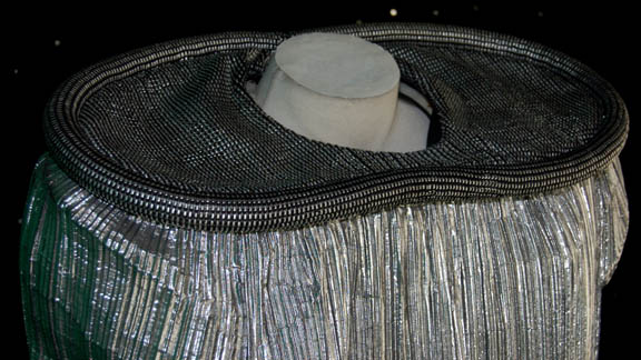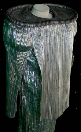 Description: A shiny silver colored costume with a large ovular collar worn by an “Antedean Dignitary” (Peter Andresfsky) in the Star Trek: The Next Generation episode “Manhunt”. Reguarded by “Mr. Worf” (Michael Dorn) as a “handsome race”, the Antedeans placed themselves into a catatonic state because they viewed space travel as too traumatic. It was soon discovered that they were in face terrorists with explosives hidden within their costumes. The costume is full length and features matching fabric sleeves, the collar snaps closed in the back of the neck and features clasps. It is assumed that only two were ever made, this being the only one left available. The costumer's tag reads ‘145 Manhunt, Antedean, Peter Andresfsky, TNG’.