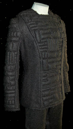 Description: A costume featured in the Star Trek: Voyager episode “Alliances” for wear by a ‘Kazon-Pommar' composed of thick gray pants with a matching gray top with a quilted geometrically patterned design. A sewn in Enterprise tag reads ‘Pablo Soriano’ indicating wear in the “Enterprise” episode “Damage” where it would have been featured as an ‘Illyrian crewman’s’ costume. Sewn in Voyager tags indicate wear by multiple actors.