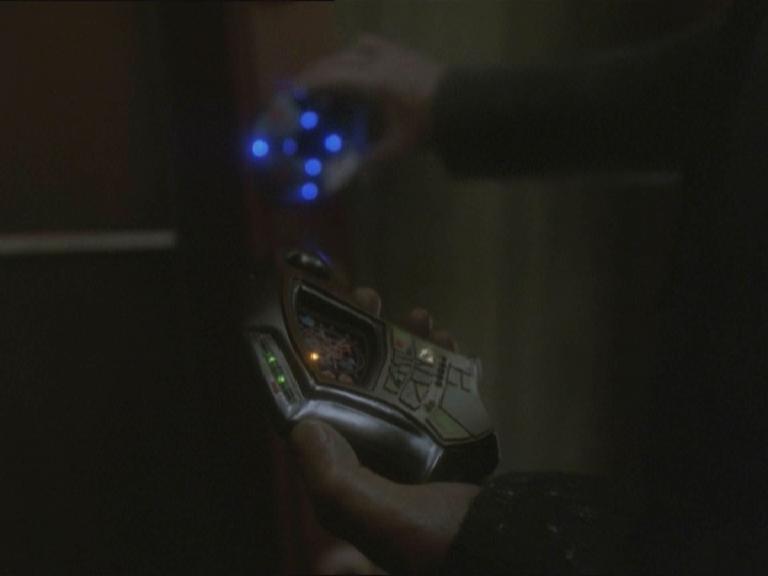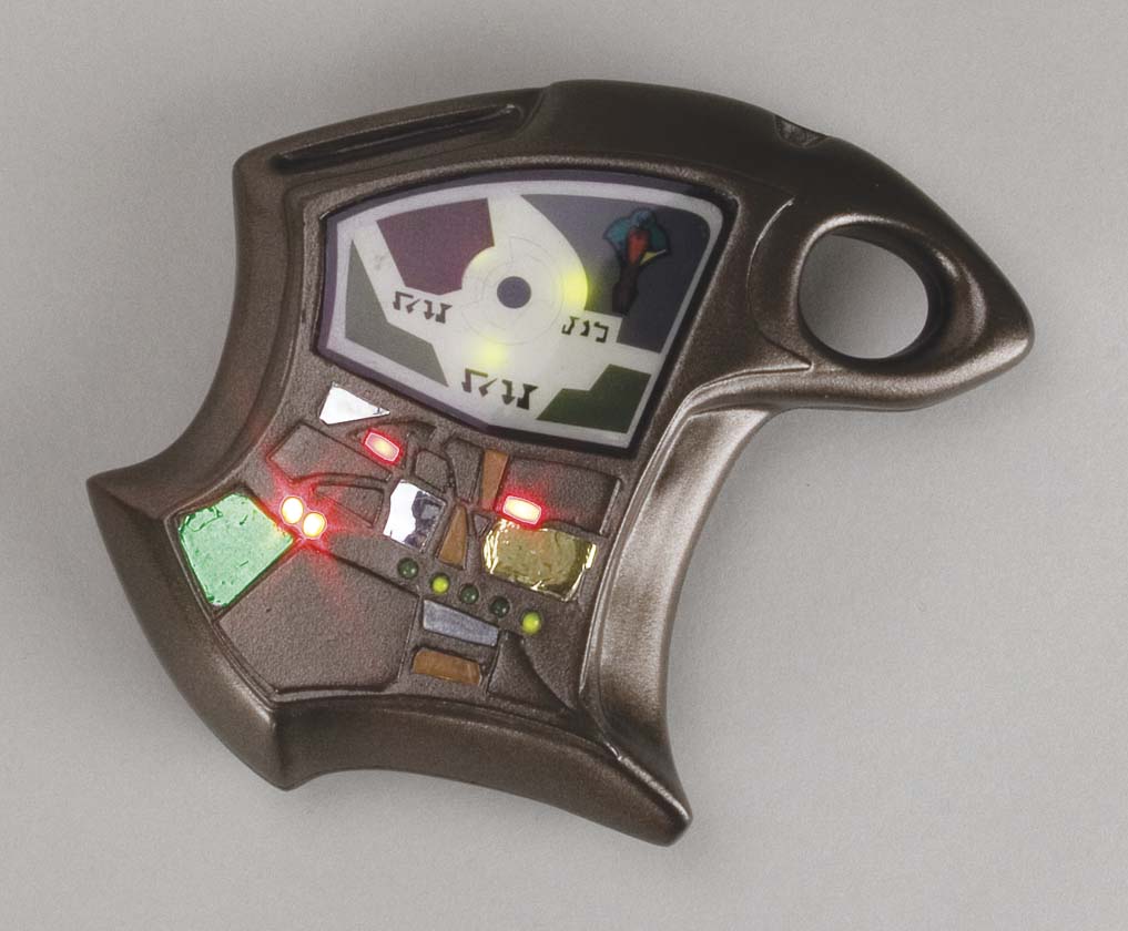Description: (Paramount-TV, 1993-99) Hero illuminating Cardassian tricorder made of gray-painted resin. There is a small trigger button at the top right that lights up the console. Measures approx. 6 in. in length.