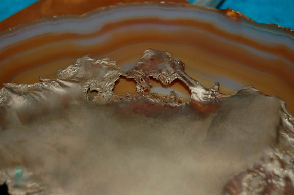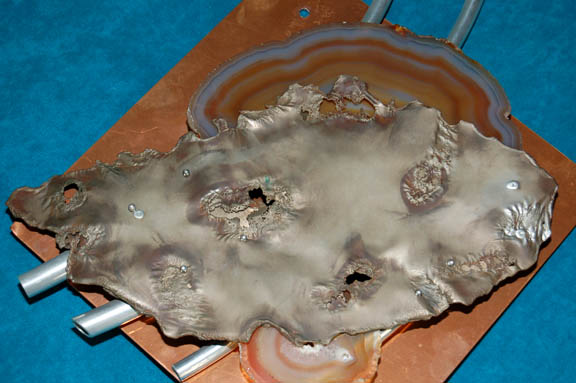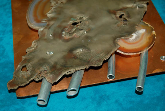 Description: This interesting wall decoration was used during the filming of Star Trek episodic television. Set on a square piece of copper color metal, the decoration features two impressive pieces of natural geode complimented and contrasted with a piece of warped metal and curved metal pipes. Measures approx. 12 x 15 x ¾ inches.