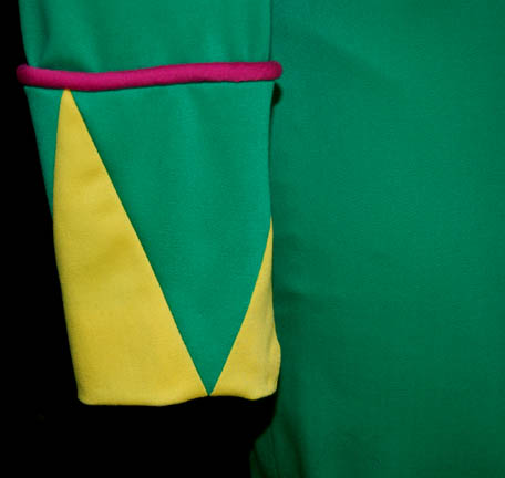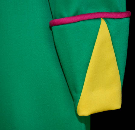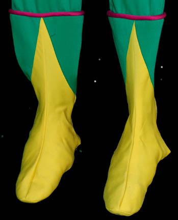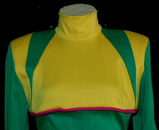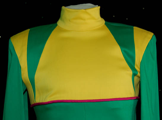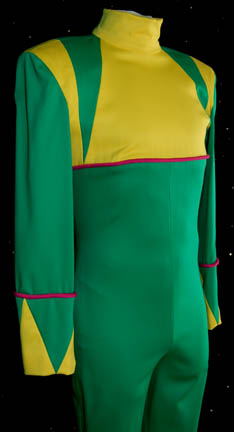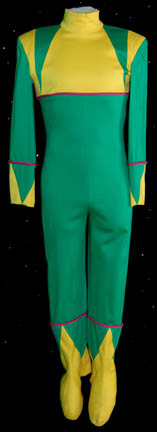 Description: The Parallax Colony was a society of humanoids whose only interest was living a life of pleasure. In the Star Trek: The Next Generation episode “Cost of Living”, “Lwaxana Troi” (Majel Barrett) takes “Worf's” (Michael Dorn) son, “Alexander” (Brian Bonsall) to a holodeck simulation of the planet so he could enjoy the “Laughing Hour” and the legendary mudbaths. This pair of matching costumes was worn by a Parallax Colony couple. Each jumpsuit is bright green with yellow feet, chevron cuffs and yellow top section. Pink trim accents the sleeves, ankles and chest and there is a zip up the back. Costumes come complete with costume tag.