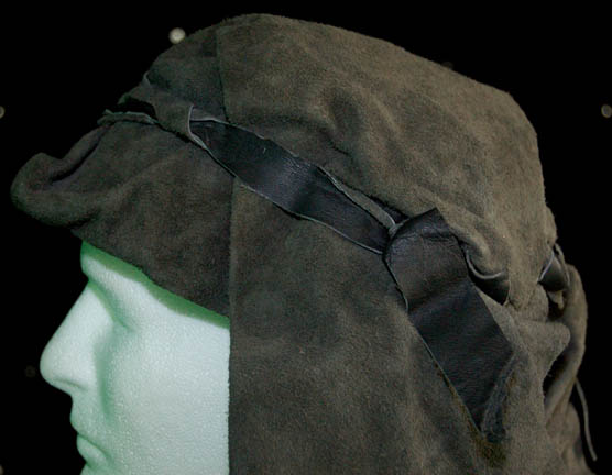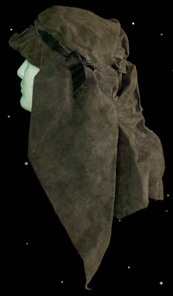 Description: This nomadic style hat was worn by “Captain Picard” (Patrick Stewart) in the Star Trek: The Next Generation episode “Final Mission” where Picard, “Wesley” (Wil Wheaton) and mining shuttle captain, “Dirgo” (Nick Tate) crash landed on a desert moon. The hat is gray suede attached to a baseball cap with the peak removed. Suede hangs down the back in order to protect the wearer from sun on their neck. Costume comes complete with costume tag.