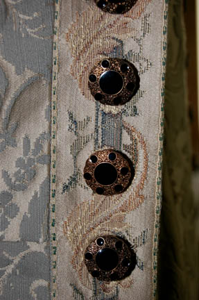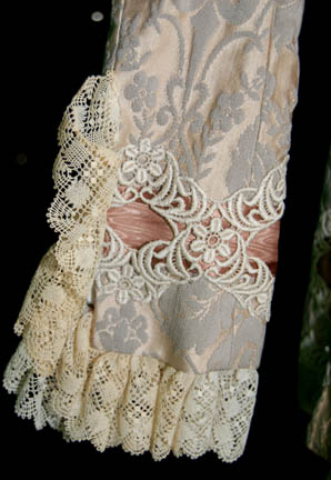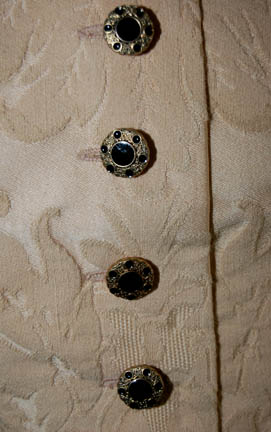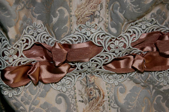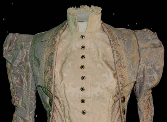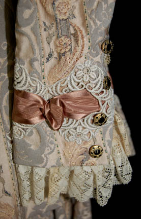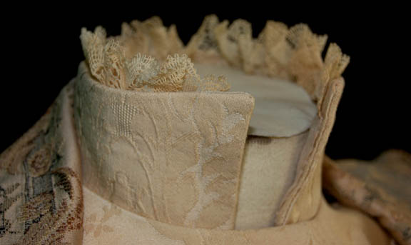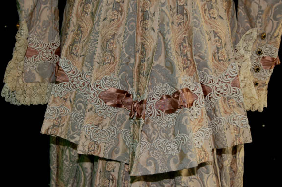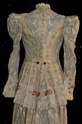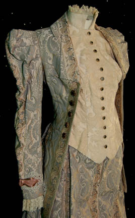 Description: This detailed costume was worn by an “Alien woman” in the Star Trek: The Next Generation episode “Time's Arrow” in which an engineering team finds evidence of an alien presence in 19th Century San Francisco. The floor length skirt was worn over a hoop skirt (not available) and is made of elaborately patterned cream and gray fabric. A brown silky ribbon passes around the base of the skirt entwined with crocheted flowers. To give it volume there is white mesh on the inside of the skirt. The jacket is made of the same fabric with pleats from the waist down, ruffles at the shoulders, black and copper colored buttons and lace at the end of the sleeves. The waistcoat worn underneath is patterned cream with black and copper color buttons down the front. It has a high neck collar with lace trim and it zips up the back. Costume comes complete with costume tag.