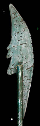 Description: Featured in many Star Trek episodes, pole-arm props like this made appearances in scenes revolving around impoverished characters, people trapped on worlds where energy weapons were rendered useless, or others where weapons had to appear as though they had been made out of ‘available' components. Pole-arms like this one appeared in the episode “Battle Lines” of Star Trek: Deep Space Nine. The item is a metal rod with a rubber ball shaped weight on one end and a rubber ‘blade’ attached to the other. The item has been painted green and allowed to scratch for a used appearance, and the ‘blade’ features gouges and nicks to appear used in battle; the adhesive for the blade is visible and some of it has disconnected due to time. The item measures approx. 48 X 4 inches.