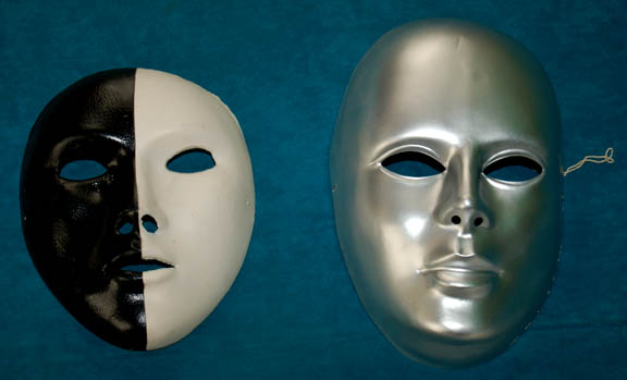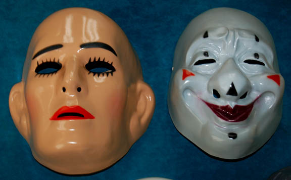 Description: This lot of thirteen masks belonged to circus performers from an artificial reality created by the Kohl during the Star Trek: Voyager episode “The Thaw” in which “Harry Kim” (Garrett Wang) and “B'Elanna Torres (Roxann Dawson) find themselves in a twisted computer program based on fear. Twelve of the masks are plastic while the black and white mask is rubber. The twelve masks include three white faces with ears, three grey clown faces, two silver variations, one white without ears, one cream, one old man and one colored face with ears.