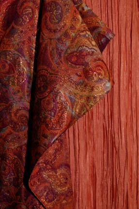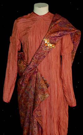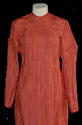 Description: A costume featured in the Star Trek: Deep Space Nine episode “The Forsaken” in which a group of ambassadors visit “Deep Space Nine” and find themselves at the mercy of their hosts when an alien computer causes problems. The costume is that of “Ambassador Taxco” (Constance Towers) and is an apricot dress and faille, crinkle pleat with a metallic gold sparkle shoulder drape with a nice pattern. The costumer's tag reads ‘The Forsaken, Taxco, Constance Towers’.