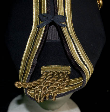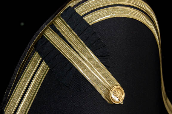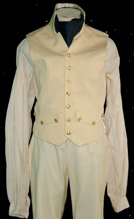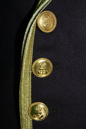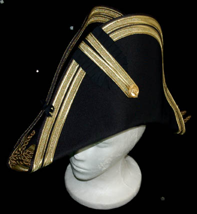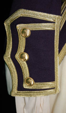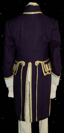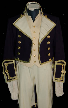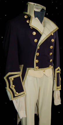 Description: Appearing in the feature film Star Trek VII: Generations, this British Royal Navy costume was worn by the ever present Pat Tallman, stunt woman in several Star Trek features and episodic television, during her portrayal of “Dr. Beverly Crusher” in the holodeck promotion of “Worf” (Michael Dorn). The costume is composed of a navy blue coat jacket with gold gilt trim, a pair of white pants, a white button front shirt, and a white vest with gold colored buttons, an officer's hat corresponding to the jacket and a pair of corresponding boots, and a neck tie. The costumer’s tag reads ‘Star Trek VII, Pat Tallman, Beverly Stunt, Scenes 35-49’ indicating scenes involving “Dr. Crusher” being pushed into the ocean by “Data” (Brent Spiner).