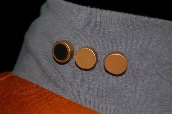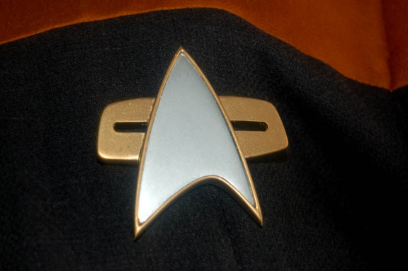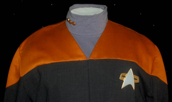 Description: A ‘fake' Starfleet operations gold division uniform jumpsuit featured in the Star Trek: Voyager episode “Live Fast and Prosper” for wear by “Mobar” (Greg Daniel), an alien con man who ‘admitted’ aliens into the ‘Federation’ by accepting payment. His costume is a mock up of a standard Starfleet uniform and he used it to portray “Voyager” security chief “Tuvok” (Tim Russ). It is a dark gray uniform jumpsuit with operations gold division shoulders and oversized rank pins indicating ‘lieutenant commander’. The gray yoke turtleneck is attached to the costume itself and not a separate. The costumer’s tag reads ‘Greg Daniel, Mobar, Fake Tuvok look.’