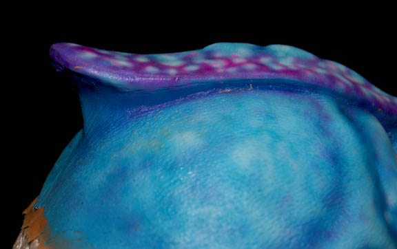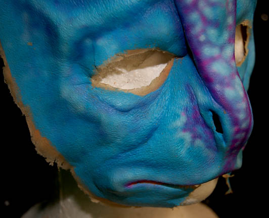 Description: This interesting blue and purple alien prosthetic was made for the filming of Star Trek episodic television. The actual prosthetic is the same as the alien creature featured in the Star Trek: Voyager episode “The Voyager Conspiracy”, however the episode alien is tan and brown as opposed to blue and purple. This may have been a study for the alien however the tanned version was chosen instead.