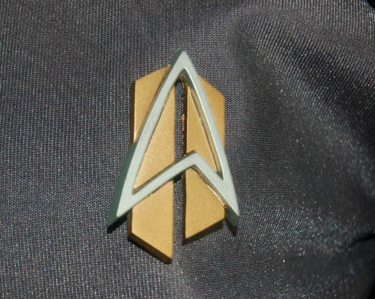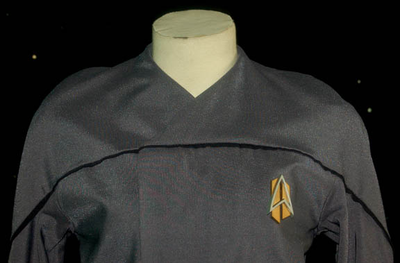 Description: A gray cadet uniform featured in the final episode “Endgame” of Star Trek: Voyager. Modeled on the future Starfleet uniforms seen in the final episode of Star Trek: The Next Generation, this full length jumpsuit features a zip up the back and a Velcro placement for an accompanying painted resin future Starfleet combadge. The costumer's tag reads ‘ST: Voyager #748 ND Starfleet’.