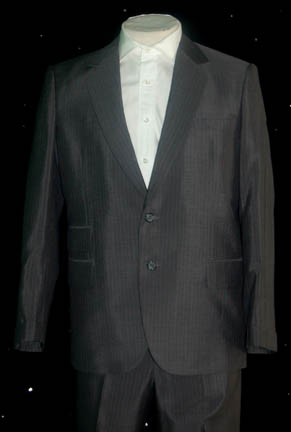 Description: Realizing the nature of their relationship to their photonic friend, the “Deep Space Nine” command crew enters the holosuite in period costume to aid the holographic Las Vegas lounge singer “Vic Fontaine” (James Darren) when holographic mobsters who are part of the program attempt to take over the holographic casino! Vic has been an inspiration and a part of their lives since he was installed helping to solve relationship troubles, keep the war weary from their disillusionment and generally entertaining it is important to the self aware computer program that the casino remains the way it has been. One of his costumes in the episode “Badda-Bing, Badda-Bang” is a classic, 1960's style suit with a gray pinstripe style and matching pants with four white button front shirts featuring extended cuffs. The costumer’s tag reads ‘DS9 #566, Vic, James Darren’.