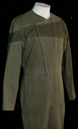 Description: A costume featured in the Star Trek: Voyager episode “Living Witness” which finds a back up version of “The Doctor” (Robert Picardo) in the far future, the only witness to the actual events which transpired between the “Voyager” crew and aliens whose historical records are vastly inaccurate. This costume jumpsuit is dark green and features an offset snap button and clasp front. The interior tag reads ‘Robert Picardo' and the costumer’s tag reads ‘Bob Picardo, “EMH Doctor” Voyager’ and the reverse reads ‘191’, presumably the episode number.