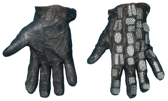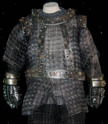 Description: An amazing costume featured in multiple Star Trek: The Next Generation episodes like “Where Silence Has Lease” and “The Emissary” worn by the ‘Skeleton Alien' in holodeck training and sparring sessions used by “Worf” (Michael Dorn). The costume is made of the most impressive inverse pyramidal shaped wire that has to be seen to be believed. The pants, tunic and elbow length sleeves are made of large 1.5 inch sized inverse pyramid squares and the forearms are made of a smaller 0.5 inch size. The costume comes with a black leather belt with sewn on studs, a similar item attached around the neck, a pair of neoprene gloves and an additional set of metallic silver painted gloves with heavily padded fingers and sewn on studs. The costume also comes with black shoes with the same 0.5 gage fabric attached to the toes. The costumer’s tag reads ‘Skeleton Alien’.