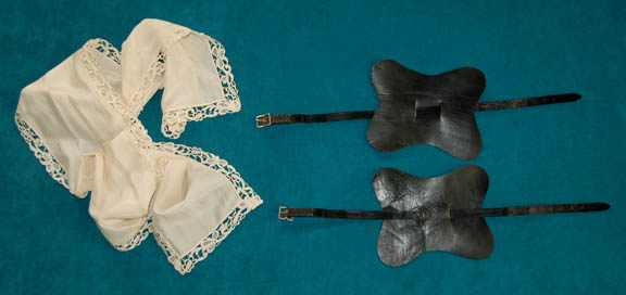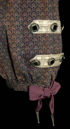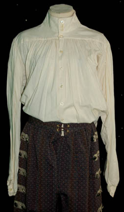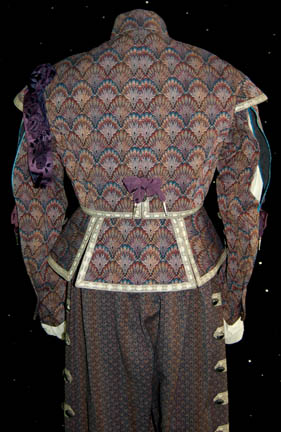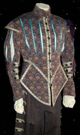 Description: An elaborate costume made for “Wil Riker” in the Star Trek: The Next Generation episode “Hollow Pursuits” played by ‘Doug Biery' (as per the costumer’s tag) believed to be a stunt person. The costume consists of brilliantly decorated components, a pair of breeches, a corresponding tunic, both made of the same patterned material with octagonal silver metal buttons featuring black square shaped ‘gem’s set into them with silver trim fabric strips, and blue slits in the tunic allowing for view of the off white button front shirt. Multiple purple bows and ribbons are present with metal tassels and a white frill trimmed tie. The costumer’s tag reads ‘Ep. 169, “Riker” Jonathan Frakes, (musketeer)’ yet another corresponds with the sewn in tag reading ‘D. Biery, musketeer #169, chg 2’.