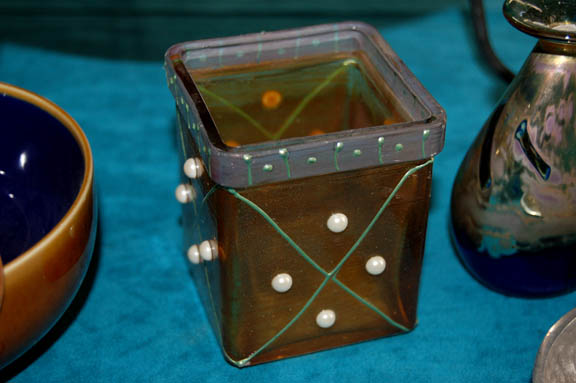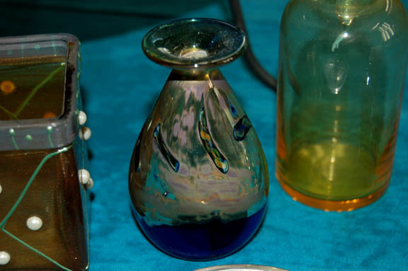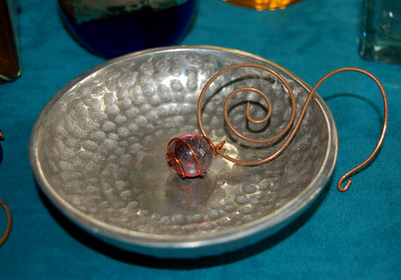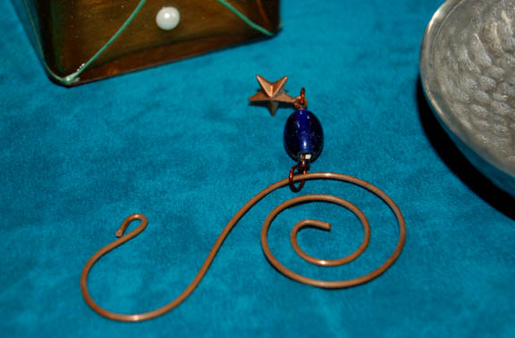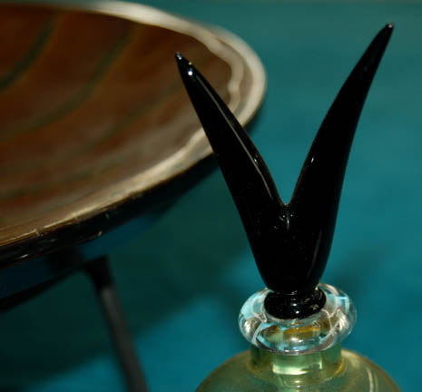 Description: This beautiful lot was used as set dressing during the filming of Star Trek episodic television and/or Star Trek feature films. The large bowl is made of plastic but looks surprisingly like ceramic with black ridges against a brown background. The three legged stand it rests on is metal and back. A small ceramic bowl that's glazed blue on the inside and brown on the outside. A small metal bowl that’s beveled over the inside and out. An opaque hand painted glass candle holder with faux jewels applied to its surface. A yellow opaque glass bottle with an interesting black glass, two pronged top. A beautiful little blue glass vase with a mother-of-pearl finish. Also included are three copper hanging decorations with colored glass balls attached. One also has a dangling star. The large bowl with stand measures approx. 5 x 11 ½ inches diameter.