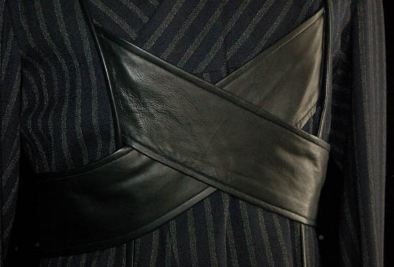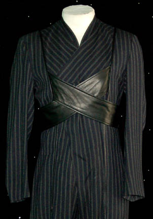 Description: A costume featured in the Star Trek: Voyager episode “Concerning Flight” worn by “Tau” (John Vargas), a pirate who stole critical components of “Voyager” itself including the emitter which allowed the “Leonardo Da Vinci” (John Rhys Davies) holodeck program to leave the ship and exist among the aliens on a nearby world. The costume is composed of a full length gray and black striped jumpsuit with a leather belt that is attached in the front and snaps in the back. The lot comes with both the hero version of the costume and a stunt one, as well as a costumers tag indicating use in the episode.