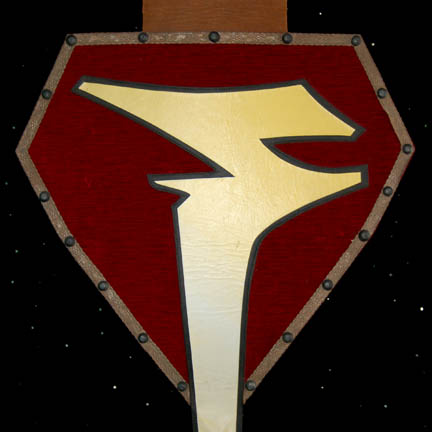 Description: A tapestry featured variously through Star Trek episodic television. The tapestry is a large diamond shaped red velvety backing with shiny silver trim and multiple metallic silver colored resin studs placed in sequence around the item. The backing is braced and holds its shape when hanging by the brown leather loop. Most interesting is the yellow Klingon symbol sewn onto the item with its long tail hanging low. The color in the symbol changes from bright yellow to a lighter hue and back again either through fading or design. The item measures approx. 77 X 33 inches.