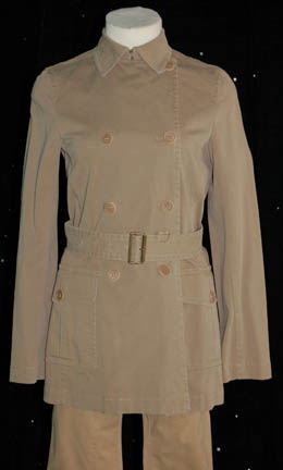 Description: “T'Pol” (Jolene Blalock) was a female Vulcan who served onboard Enterprise NX-01 under Captain Jonathan Archer (Scott Bakkula) during the Star Trek: Enterprise series. This is her civilian attire including form fitting tan stretch pants (Guess Jeans) and a stylish double-breasted tan jacket (Theory). The sewn in tag in the pants reads “Enterprise – Jolene Blalock #063” indicating wear in the Enterprise episode “Carpenter Street”.