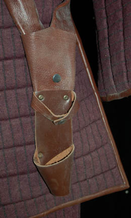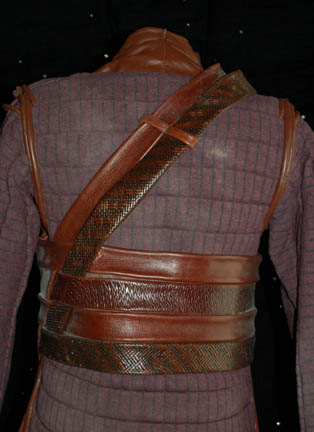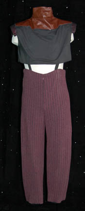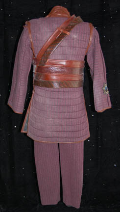 Description: Appearing in the episode “Detained” of Star Trek: Enterprise this costume is made up of several parts; purple quilted pants with black inset lines and black elastic stirrups and suspenders, a matching coat with brown leather accents and a ‘Tandaran' patch on each sleeve forearm, and a leather neck wrap with attached shoulder pads. There is also a leather quadruple belt and a harness with a holster for a ‘shock stick’ (sold separately). The costume was worn by Vince Deadrick who appeared frequently on Enterprise as a stunt performer, and dust from the stunts is still present.