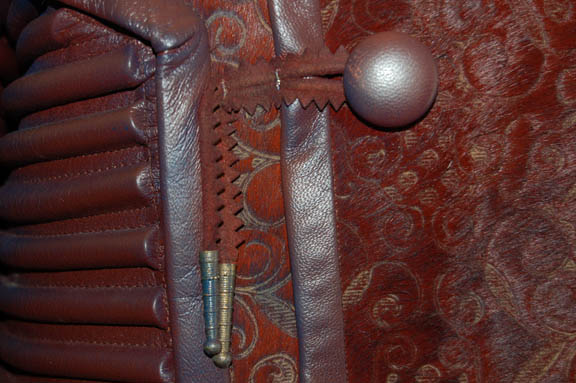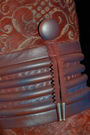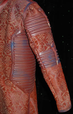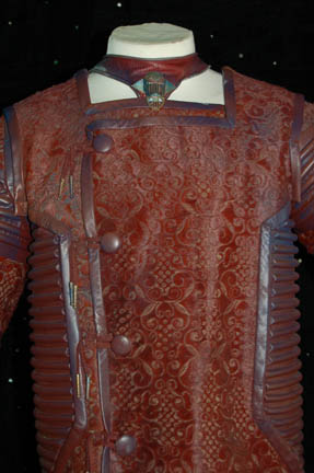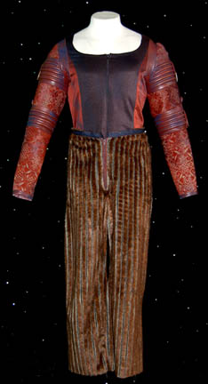Description: Having entered the ‘Delphic Expanse' the crew of “Enterprise NX-01” searches for information about the mysterious Xindi who recently attacked Earth. One of their missions takes them to a marketplace filled with all sorts of interesting characters, one of which insists on selling a sex-slave to the crew. “Zjod” (Steve Larson) was a colorful yet insidious character and not prone to fighting, that’s why this stunt version of his costume was produced for his scuffle with “Captain Archer” (Scott Bakula). The costume is comprised of synthetic fur pants with inset streaks of black running horizontally, and a synthetic leather and faux fur sleeveless apron; the fur is accented with incredible patterned detail, tassels, and buttons. The apron seals up the front with snaps and clasps over a long sleeved shirt made of matching material with similar accents, while the body of the shirt is black fabric. It also includes a matching necklace that doubles as a hair wrap. This being the stunt version of the costume it is labeled ‘Charlie Brewer’.