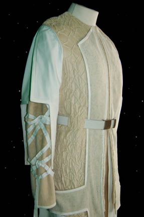 Description: “Captain Archer” (Scott Bakula) and “Commander Shran” (Jeffery Combs) have traveled to the Aenar city in an attempt to discover the source of Romulan attacks using a strange alien ‘telepresence' known only to the secretive tribe. Believed to be a myth until they showed themselves to the Andorian government, the Aenar have lost one of their tribe to sinister Romulan agents who have kidnapped him in the episodes “United” and “The Aenar”. This costume is that of an ‘Aenar physician’ who helps to heal “Shran” after he takes a bad fall in the episode. The costume is a jumpsuit with fur pants and sleeves, a suede and wool; diamond pattern ‘lab coat’ goes on over that with half sleeves and a white belt with a metal buckle. The costumer’s tag is inscribed ‘Robert Schwertzer’.