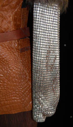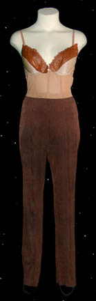 Description: This shapely Klingon costume was worn by “Bu'kaH”(Michelle Bonilla) during the Star Trek: Enterprise episode “Sleeping Dogs” where she appeared as an engineer onboard IKS Somraw. The formfitting jacket is embossed brown leather in a reptilian pattern that Velcro’s closed at the front. The fabulous sleeves and collar are made of faux fur with the lower section of the sleeves created from chain-mail. The accompanying stretchy pants are brown with a built in bodice that has matching embossed leather across the breast area. It zips up the back and has stirrups at the feet. Two brown faux leather belts complete the outfit and both items have inside tags that read “Enterprise – Michelle Bonilla #15”. The costume comes complete with a costume tag.