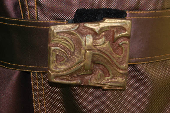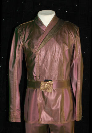 Description: The Vulcans are a humanoid race from the plant Vulcan who are known for their great sense of logic and stoic nature. They were one of the instrumental species responsible for establishing the United Federation of Planets. This is a Vulcan Officer uniform from the Star Trek: Enterprise series. Made of copper color vinyl, the uniform consists of a sleeveless jumpsuit that zips at the front and a matching fitted jacket that also zips at the front. The jacket has stitched patterns and variant vinyl patterning around the shoulder. There are two snaps located on the left collar for rank insignia to be attached (not included). The uniform is complete with a vinyl belt and has a distinctly Vulcan buckle that attached with Velcro. The inside tags indicate wear by various actors.