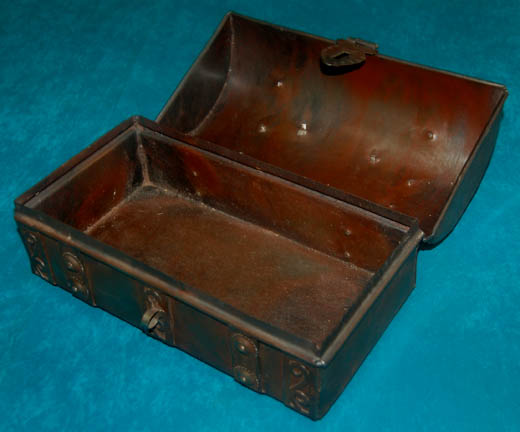 Description: A brown metal chest used during the filming of Star Trek episodic television and/or Star Trek feature films. The chest has detailed metal embellishments soldered onto the surface and a handle on the top. It has a latch on the side that can be closed with a lock (Not included). Measures approx. 12 x 6 ½ x 5 ¾ inches.