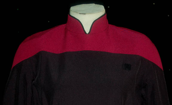 Description: A costume featured in various episodes of Star Trek: The Next Generation like “The First Duty”, voyager's “In the Flesh”, and Deep Space Nine’s “Homefront”. The costume is a black jumpsuit with red shoulders, functional pockets on both legs with faux flap seals, and a thin black belt. There is a Velcro placement for a Starfleet combadge on the left breast (sold separately). The costumer’s tag reads ‘Cadet, red’ and ‘TNG’.