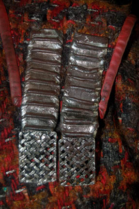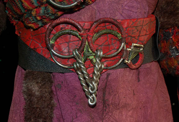 Description: A costume featured in the Star Trek: Voyager episodes “Lifesigns” and “Dreadnaught” for wear by “Lorrum” (Michael Spound), a member of the Kazon-Nistrim sect in collusion with “Seska” (Martha Hackett). His costume is composed of a blotchy blue woven trousers and a red lined blue and black woven shirt over which is worn a cropped woven multi-colored jacket with molded rubber and metal accents at the neck. The outer coat is distressed mauve suede with bunched fur lining on the sleeves, the shoulders, and down the neck. The costume is finished off by an elaborate rubber belt and knitted multi-color sash with a variety of unattached metal accents. The costumer's tag indicates wear in the episode “Lifesigns” and indicates further use by other actors.