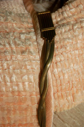 Description: A gold colored costume featured in the Star Trek: Voyager episode “Emanations” for wear by a “Vhnori” alien. The costume is a jumpsuit with pleated sleeves to appear ribbed and a pink rose colored overdress featuring a bronze colored metal wound chain accent hanging from one shoulder and draping across the chest where it is affixed. The costumer's tag reads ‘Chad Valchar’.