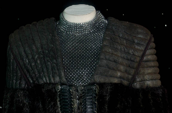 Description: A costume featured in multiple Star Trek episodes, firstly in Voyager for wear by Kazon-Pommar in episodes like “Alliances”, and then by Illyrian's of the Delphic Expanse in the Enterprise episode “Damage” where slight additions were made to the costume. The costume is made up of gray trousers with a matching costume top that is quilted in geometric pattern. The Enterprise additions are a pair of black rubber boots with leather strapping and distress to appear aged, and a leather harness worn over the costume top with metal buckles; these components were also featured in the Voyager episode “Resistance” when they were part of a ‘Mokra’ soldier costume. The costumer’s tag reads ‘Alliances, Pommar’ with a “Voyager” stamp, and the interior Enterprise tag reads ‘Jeff Smolenk #71’.