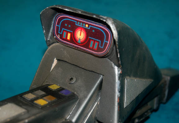 Description: A prop energy weapon featured in the Star Trek: Deep Space Nine episode “Shakaar” for use by “Major Kira” (Nana Visitor). The prop weapon is solid cast resin painted metallic silver and gunmetal with multiple raised details and colored buttons. The item features a ‘display screen' and a painted red trigger measuring approx. 23.25 X 10 X 4 inches.