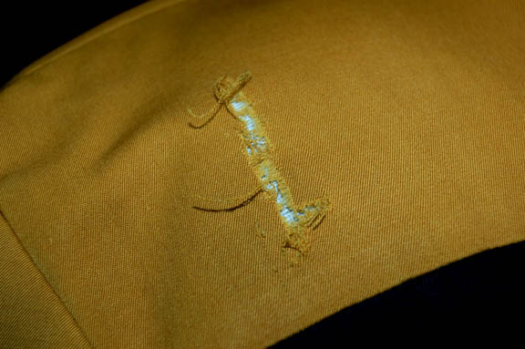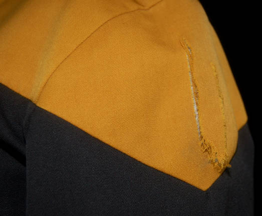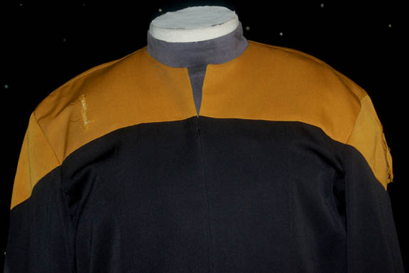 Description: An operations gold uniform worn by Tim Russ while portraying “Tuvok” in various episodes of Star Trek: Voyager. This distressed Starfleet uniform jumpsuit is black with operations gold division shoulders and comes with a gray turtleneck sleeveless undershirt. The costume is distressed in that the undershirt features a pair of small rips on the collar, and the division color has significant tears on both shoulders and a degree of thrashing in the middle of the back. Both garments feature sewn in Voyager tags reading ‘Tim Russ'.