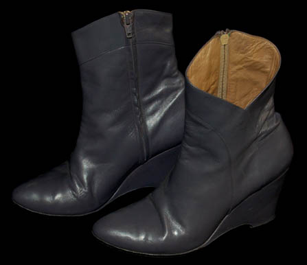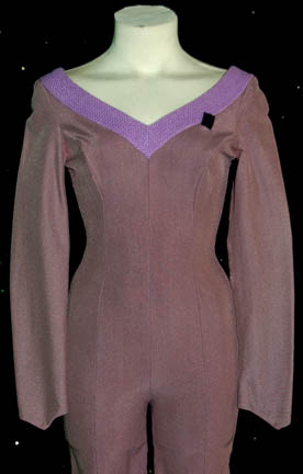 Description: A casual jumpsuit featured in various episodes of Star Trek: The Next Generation for wear by “Councilor Troi” (Marina Sirtis) with corresponding purple died boots. The jumpsuit is form fitting spandex with a low cut bust and a light purple trim around the neck where is sewn on a Velcro placement for a Starfleet combadge (sold separately), the boots zip up the inside with solid heels. Both feature costumer's tags reading ‘Marina’ or ‘Marina Sirtis’ and ‘Troi’.