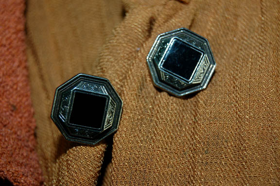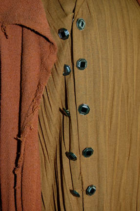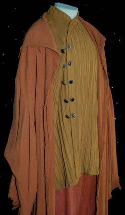 Description: The Vulcans are a humanoid race from the plant Vulcan who are known for their great sense of logic and stoic nature. They were one of the instrumental species responsible for establishing the United Federation of Planets. This is a Vulcan costume from the Star Trek: Enterprise series. It includes a gold pleated shirt with silver and black metal buttons up the front however the shirt actually has snaps to close. There is some distress to the left shoulder. The pants are pumpkin color with a small pocket on the right side. Worn over the top is an orange robe with a hood and fringe trim. Costume comes complete with costume tag.