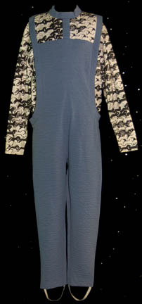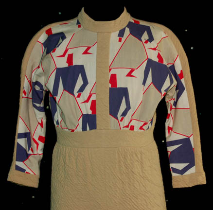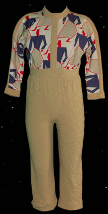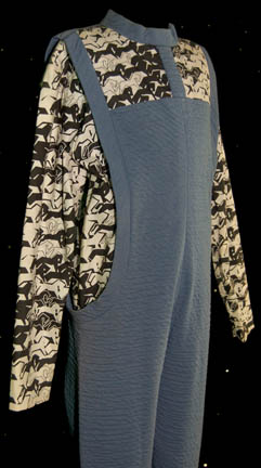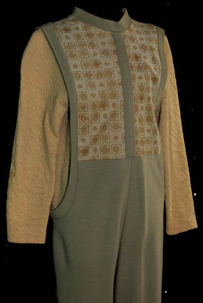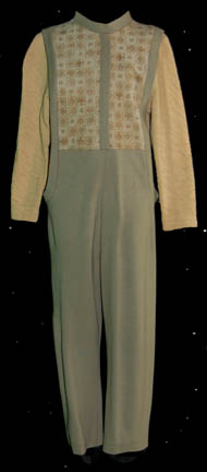 Description: “Ian Troi” (R.J. Williams) was an alien entity who wished to experience being Human in the Star Trek: The Next Generation episode “The Child”. He started his human existence as a fetus inside “Deanna Troi” (Marina Sirtis) and reached full term after thirty-six hours. He reached the age of 8 before sacrificing himself to experience death and to save the crew for the radiation his presence exuded. His jumpsuit has pale olive green legs with tan puckered sleeves and patterned velvet chest and back. The accompanying two costumes were worn by additional children in the episode. The first is a jumpsuit with puckered tan legs and sleeves with a geometric human patterned top section in red and blue. The second jumpsuit has blue pants and bib with a black and white horse print design on the sleeves. All costumes come with their own costume tags.