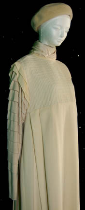 Description: Riva's Chorus was a group of three telepaths that attuned the famed mediator “Riva’s” (Howie Seago) thoughts and emotions since he was deaf. They were featured in the Star Trek: The Next Generation episode “Loud as a Whisper”. This costume was worn by the “Scholar / artist” since each member of the trio spoke for different aspects of Riva. The costume includes a cream tunic with a pleated chest and ruffled sleeves. The pants are cream with snaps at the ankles to create a pleat in the leg. The cream beret is soft felt. Costume comes complete with costume tag.