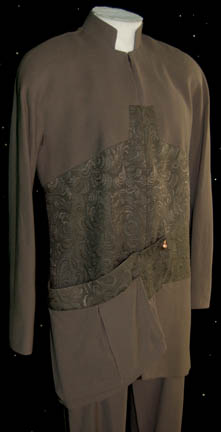 Description: “Pran Tainer” (William Lithgow) was an Atrean geologist featured in the Star Trek: The Next Generation episode “Inheritance”. He worked with the crew of the U.S.S. Enterprise-D in trying to find a solution to the geological problems on his homeworld Atrea IV. The smock style jacket is olive green with a patterned mid section, a pocket on the right side and a zip up the front. The pants are matching olive green. Costume comes complete with costume tag. The sewn in tags indicate that this costume was reused during the Star Trek: Deep Space Nine series.
