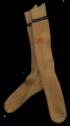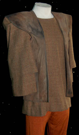 Description: The Romulans are a warrior civilization from the planets Romulus and Remus who founded their Romulan Star Empire two thousand years ago. This is a Romulan civilian costume from the Star Trek: The Next Generation episode “Unification, pt II”. The top is brown tweed with the customary wide padded shoulders and layered sleeves. The brown waistcoat is suede, the cropped pants are brown velvet and the socks are peach color with two blue bands at the top. Costume comes complete with costume tag.