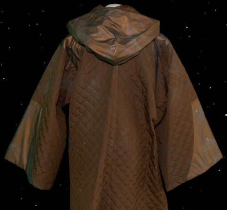 Description: This costume was worn by a bar alien during the Star Trek: Enterprise episode “The Seventh” in which “T'Pol” (Jolene Blalock) asks “Captain Archer” (Scott Bakula) to go on a covert mission to capture a fugitive who had avoided the Vulcan High Command for over twenty years. The costume is a large brown quilted overcoat with vinyl trim and a hood. It zips up the front and there is intentional paint splatter on the sleeves.