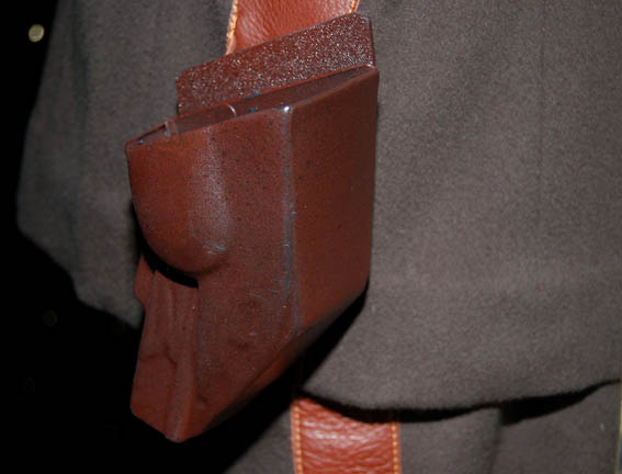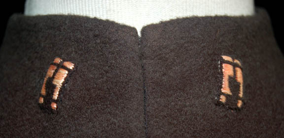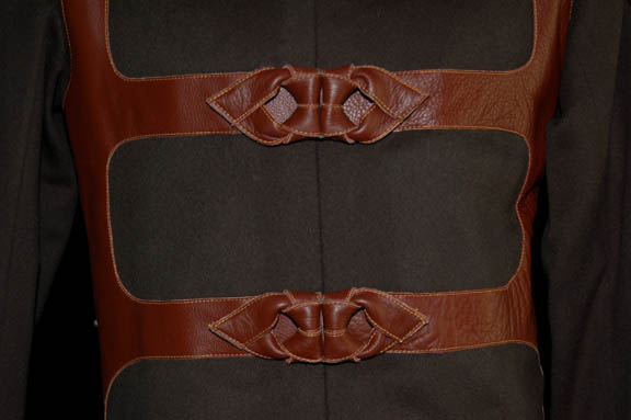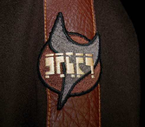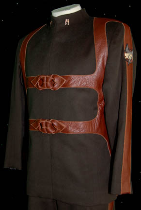 Description: The “Takret” are a humanoid species originally from the Takret System who were featured in the Star Trek: Enterprise episode “Catwalk”. This costume was worn by a “Takret Officer” (Sean Smith) who was a member of a boarding party that attempted to seize control of the Enterprise while the crew was sheltering from a neutronic storm. The costume has a green wool jacket with brown leather straps and a zip up the front. On each sleeve are sewn on Takret patches and on each side of the collar are rank patches. The accompanying pants are green wool with a brown leather strip down each side. Costume comes complete with costume tag.