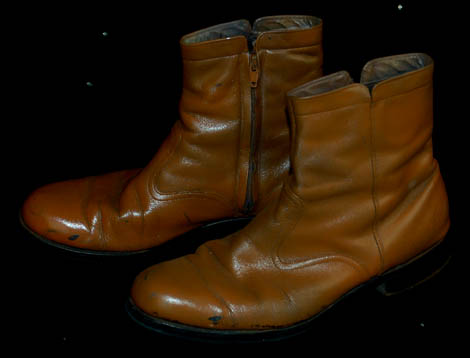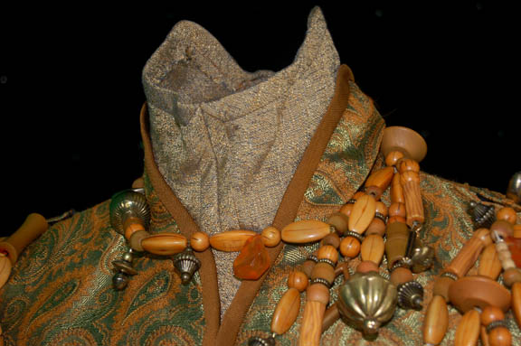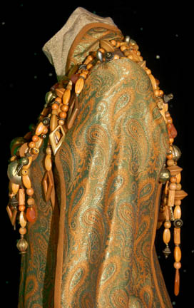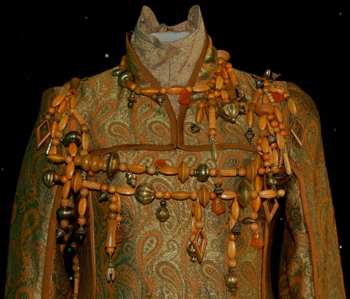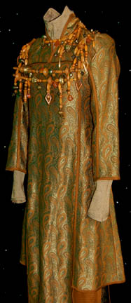 Description: The “Kreetassans” where a humanoid race capable of warp speed and native to the planet Kreetassa. They were featured in several Star Trek: Enterprise episodes however this costume was featured in the episode “Vox Sola”. The costume includes a gold and orange paisley pattern tunic with orange trim and an extended central panel at the bottom. Hanging around the neck are brown beads interspersed with brass and faux brass beads and faux amber pieces. The two rows across the chest are hung on wire to keep their structure. Worn underneath the tunic is a gold color top with a high round collar and a pair of Lycra pants. The costume is completed with tan ankle boots. The accompanying costume tag under the show section reads “Enterprise 022 – The Needs of One” which was the original name of the episode before it was later changed to “Vox Sola”.